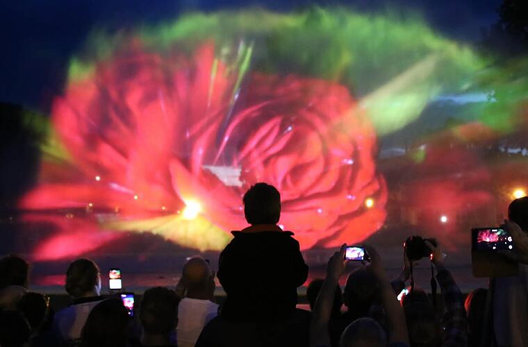 Mehrere Dutzend Interessierte haben am Samstag um 22.30 Uhr vergeblich auf die Brunnen-Show am Rosengarten gewartet. Statt bunter Beamer-Bilder schaltete der Brunnen einfach ab. Nachtruhe. Die Stadt hatte zu Beginn der vergangenen Woche im Zusammenhang mit den Wartungsarbeiten noch die Lichtshow für diese Uhrzeit angekündigt. Diese Meldung übernahmen wir für einen redaktionellen Bericht und die Veranstaltungsseite.