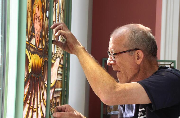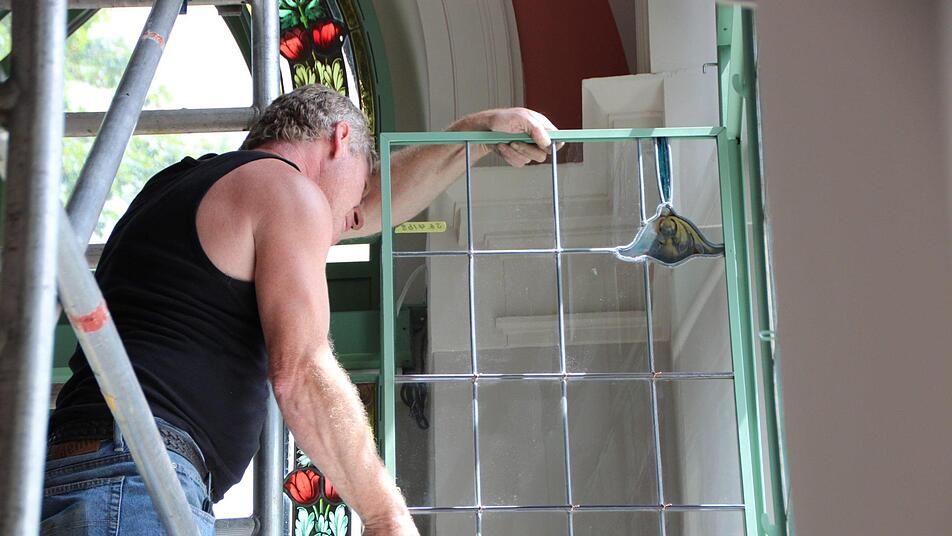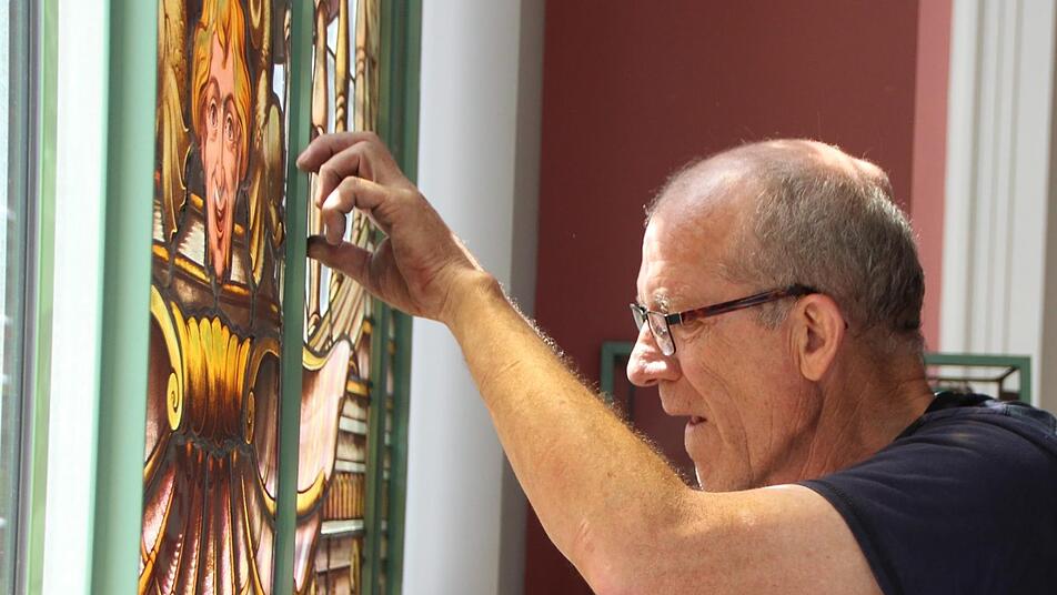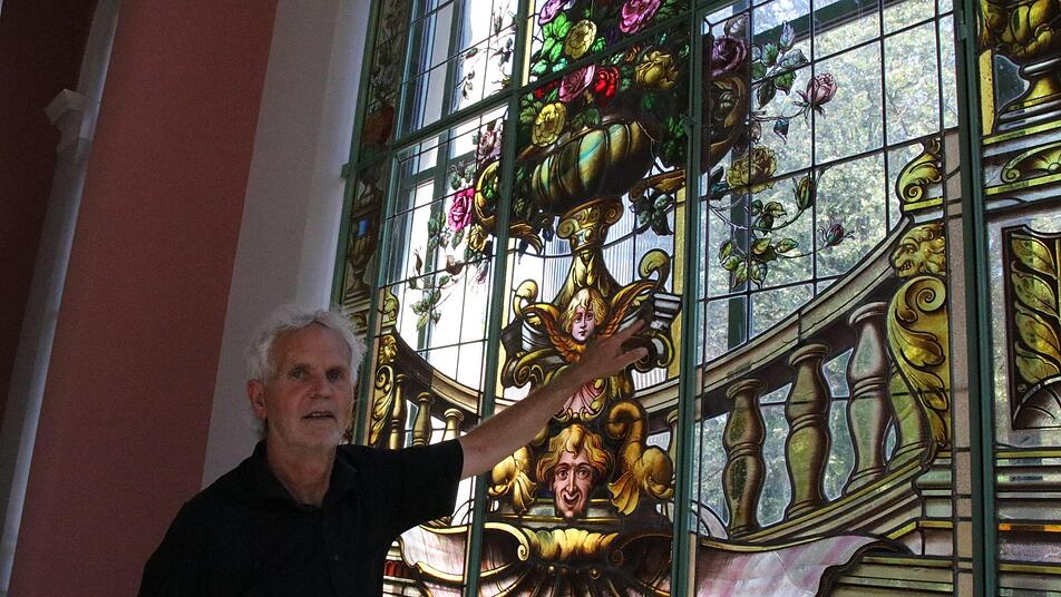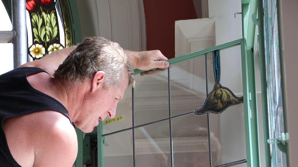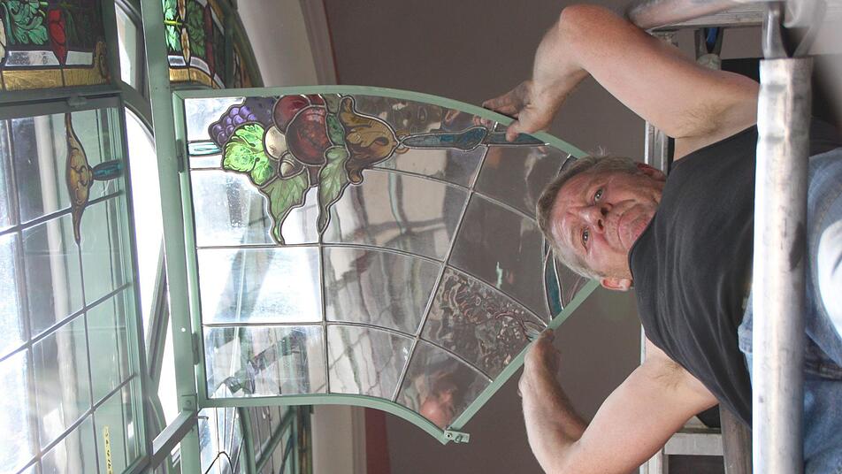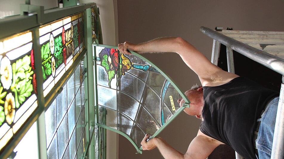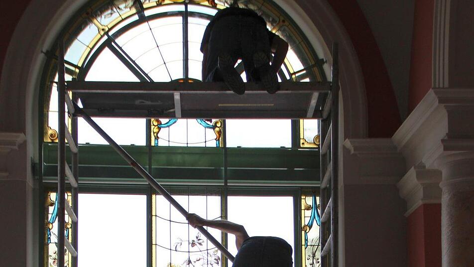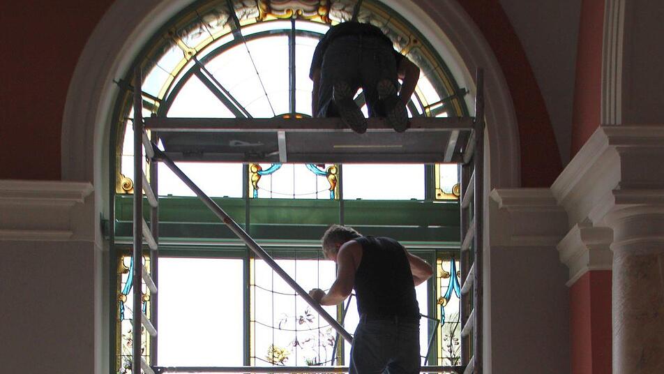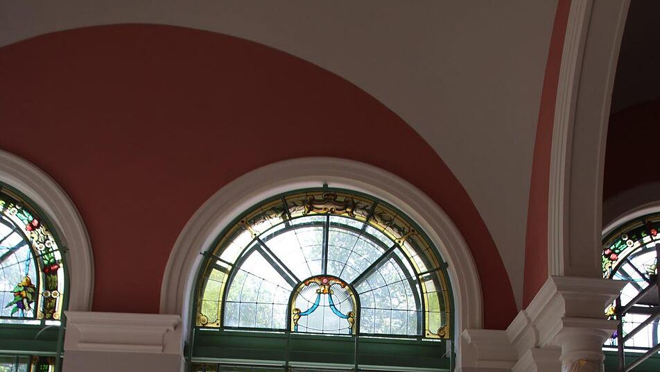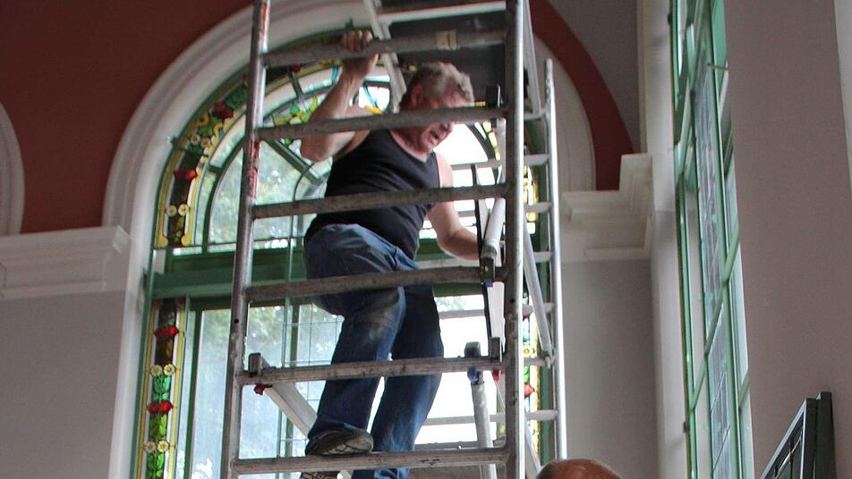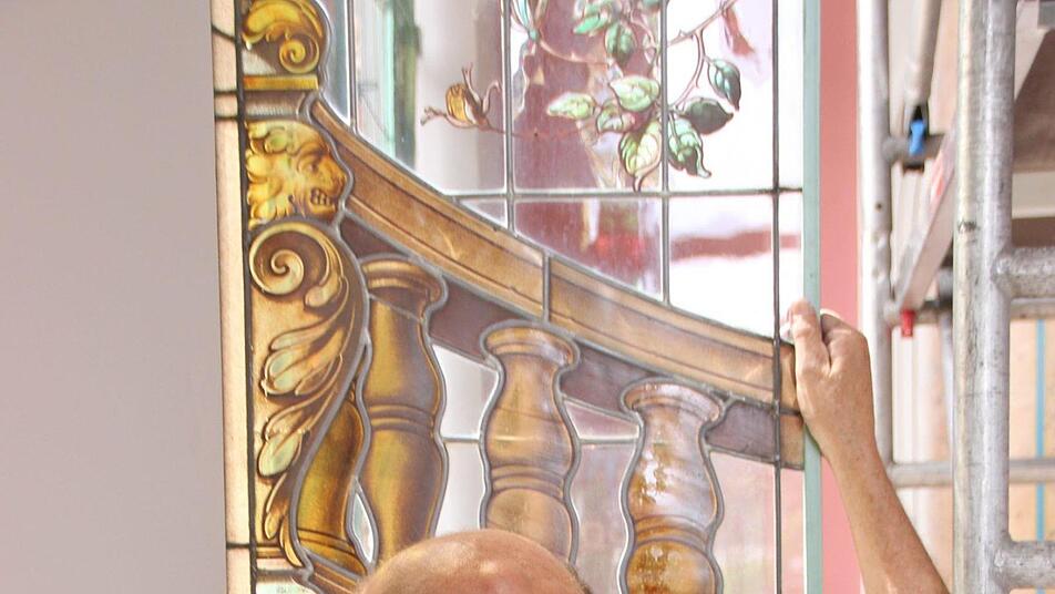 Nach und nach schmücken die frisch restaurierten Buntglasfenster wieder den Südflügel des Luitpoldbades. Die viereinhalb Meter hohen Rahmenkonstruktionen wurden bereits angebracht, jetzt tragen Monteure die empfindlichen Fensterelemente in die beiden Eck-Pavillons und setzen sie vorsichtig ein. Peter Adrian von der Paderborner Glasmalerei Peters deutet auf eine rund 20 Kilogramm schwere Fensterscheibe. "Sie kommen alle exakt wieder an den Platz, an der wir sie vor rund drei Jahren abgebaut haben", sagt er.