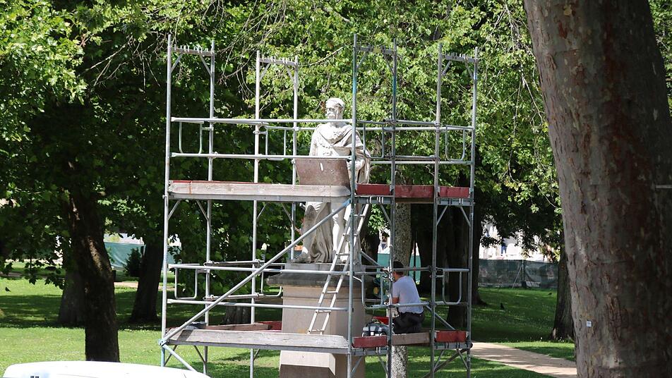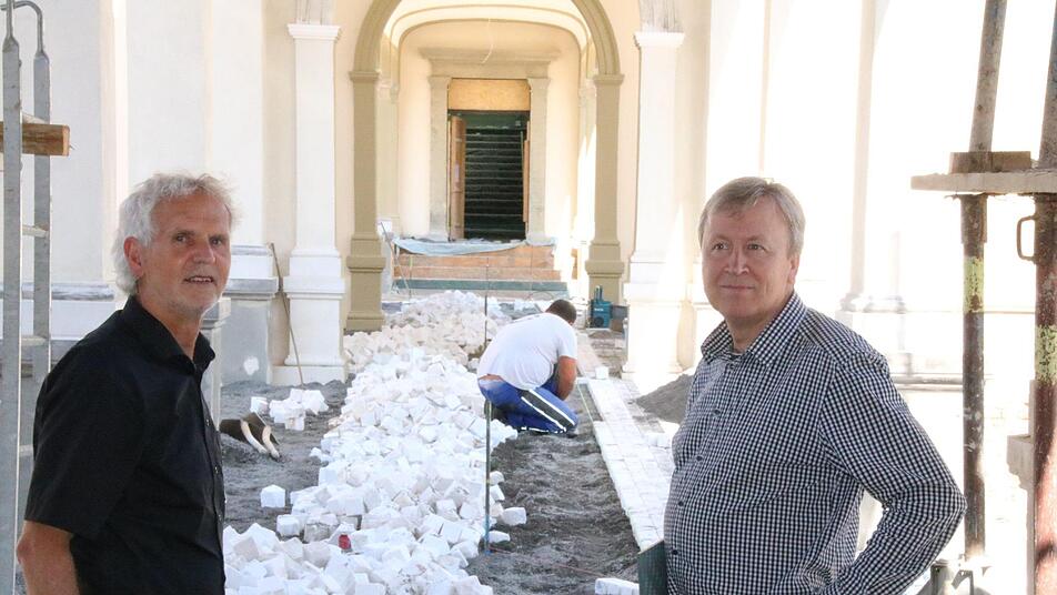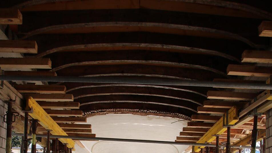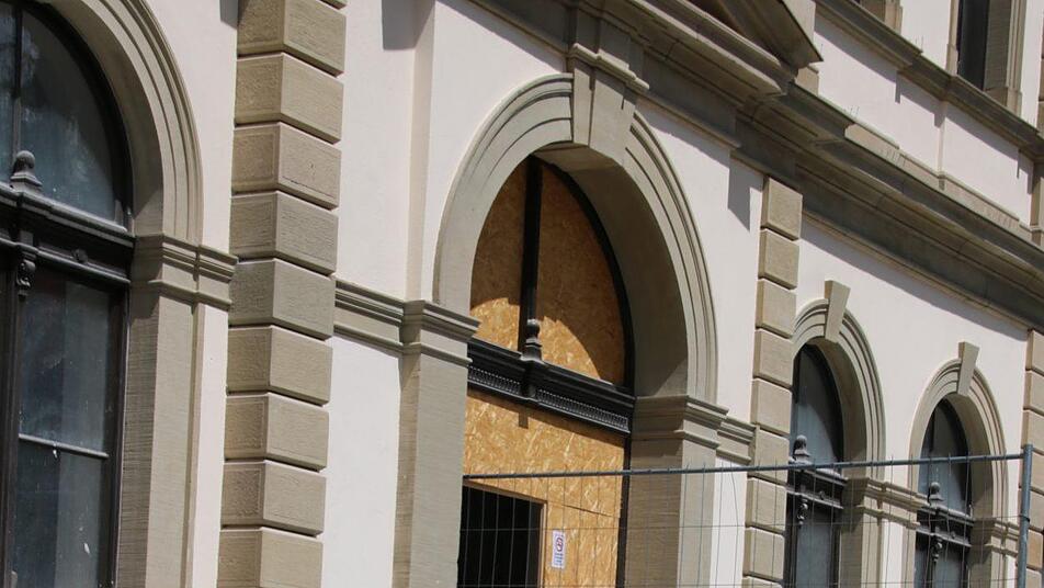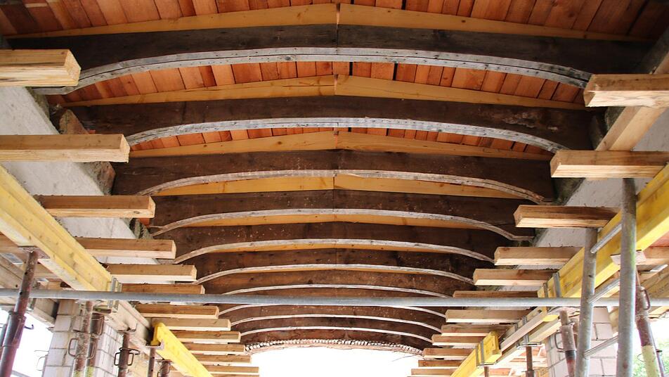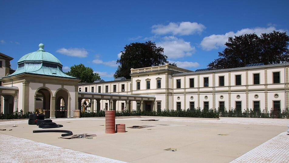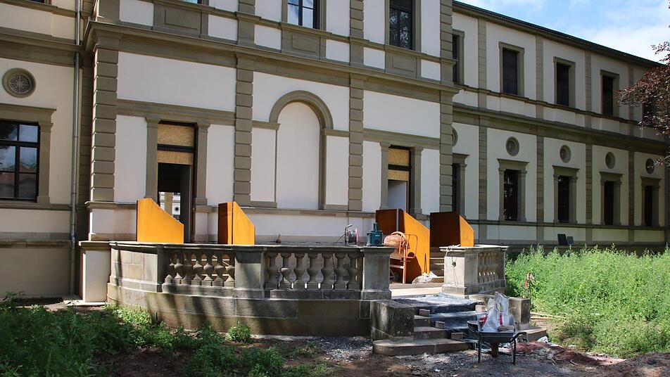 In seiner ganzen Pracht ist das denkmalgeschützte Gebäude bereits von außen zu sehen. Kein Gerüst stört mehr den Blick. "Nur ein einziges steht noch", verweist Alsheimer darauf, dass im Innenhof die Lücke in der historischen Querspange aktuell geschlossen wird. Bis zuletzt wurden dort die Materialien in den Innenhof transportiert, jetzt wurde nach dem historischen Vorbild ein rund acht Meter langer Bogen betoniert.