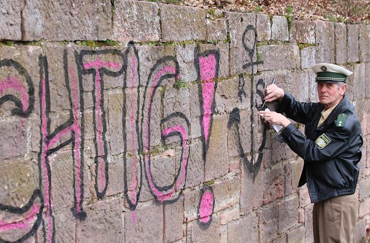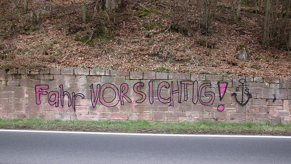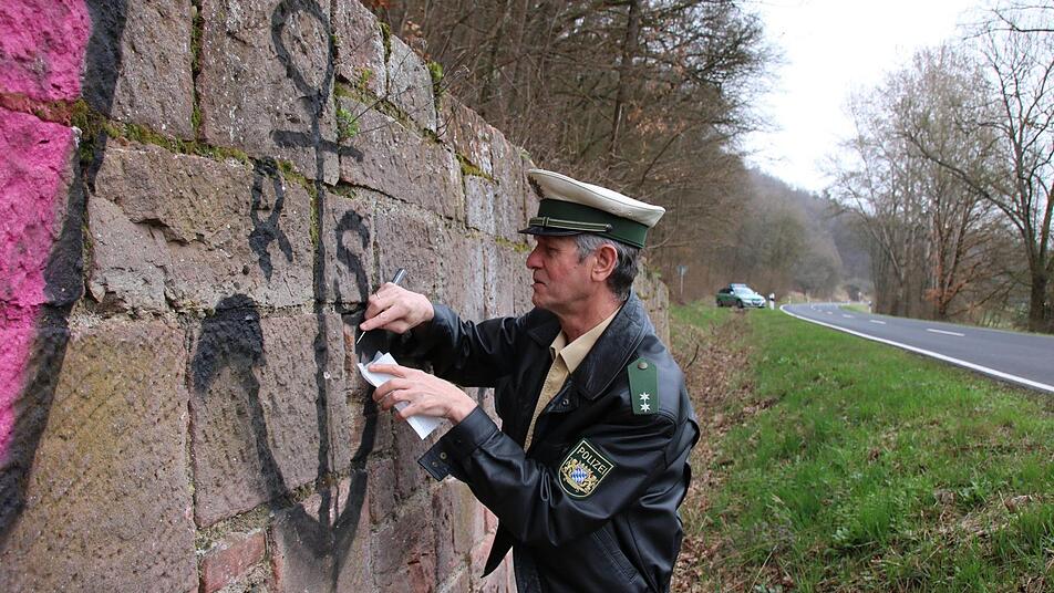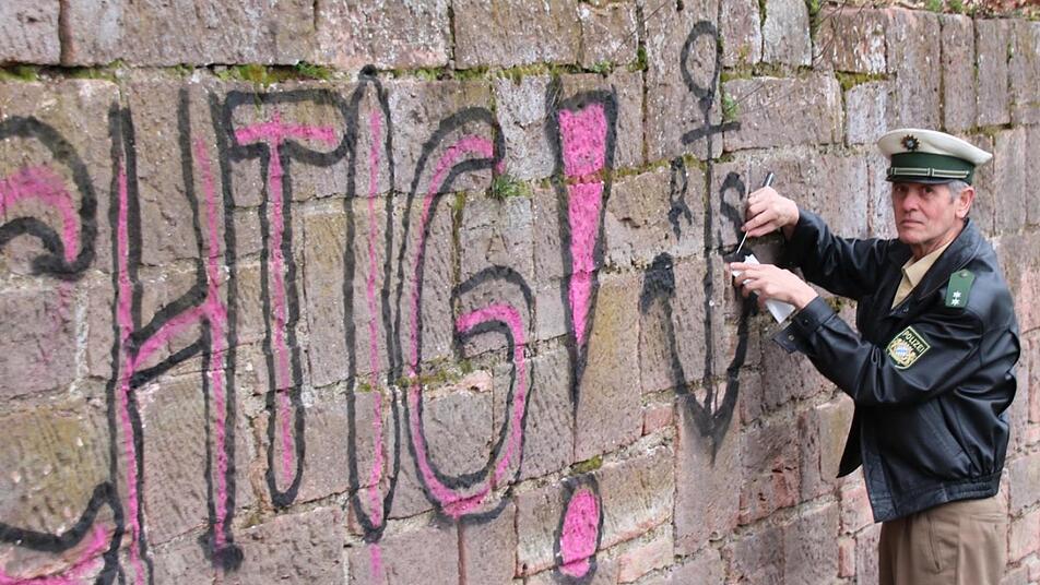 Mit einem Messer kratzt Polizist Peter Kähne schwarze Farbe von Sandsteinen in ein kleines Tütchen. "Ich sichere an allen Stellen Farbspuren", erzählt er, vielleicht seien darüber später Rückschlüsse auf die Täter möglich. "Fahr vorsichtig" steht in großen Lettern an einer Mauer neben der Straße zwischen Aschach und Hohn. An der Botschaft wäre nichts auszusetzen, wenn sie nicht in schwarz und pink als Graffiti illegal gesprüht worden wäre. Die Bad Kissinger Polizei ermittelt wegen "Sachbeschädigung im öffentlichen Raum".