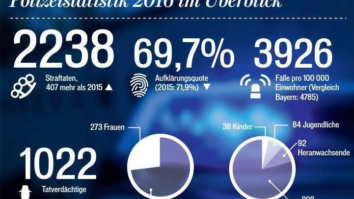 Positiv sieht PI-Chef Haschke trotz eines leichten Rückgangs die hohe Aufklärungsquote seiner Dienststelle: 1559 der 2238 Fälle wurden aufgeklärt, macht 69,7 Prozent. Damit liege die PI weit über dem Landesdurchschnitt von 63,7 Prozent.