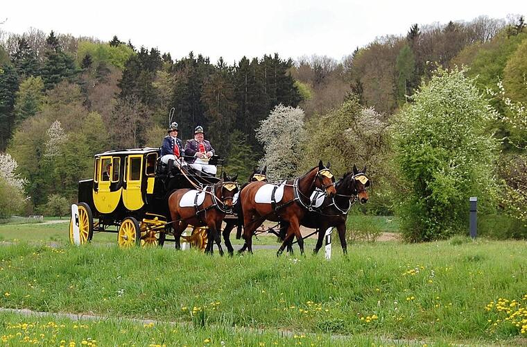 Gekonnt hatte Keßler nach Bürgermeister Anton Schick und Kurdirektor Frank Oette die Kutsche vor dem Regentenbau bestiegen. Vielleicht hätte es dem Kirchenmanager als begeistertem Reiter und Kutschfahrer ganz vorn auf dem Kutschbock besser gefallen, doch ließ sich Yvonne Körner die Zügel nicht aus der Hand nehmen. Seit 2011 sitzt sie donnerstags bis sonntags, meistens mit Freundin Stephanie Seufert als Postillon, auf dem Bock der einzigen noch regelmäßig verkehrenden Kutsche der Deutschen Post.