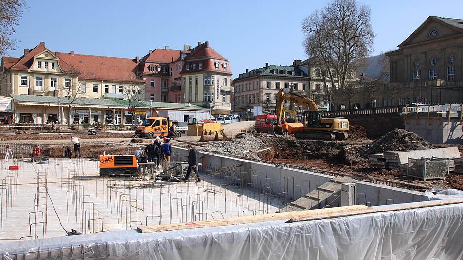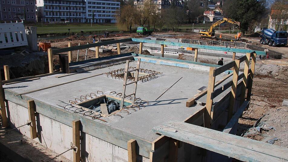 Bereits fertig betoniert ist das Gebäude für die Pumpentechnik. Die Betonwände werden nun mit Buntsandstein verkleidet, auf dem Dach entsteht ebenerdig mit der Ludwigstraße eine Aussichtsplattform. Die zahlreichen Düsen, Licht und Musik können in Zukunft vom Rathaus und der Staatsbad GmbH aus gesteuert werden.