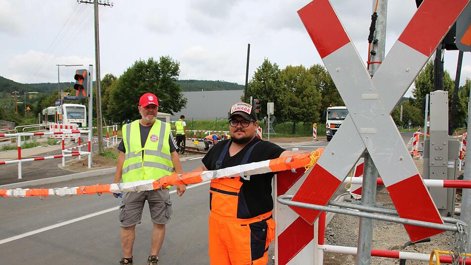 Am weitesten fortgeschritten sind die Bauarbeiten der Firma Hell aus Eltingshausen am Bahnübergang Westheim. "Es handelt sich hier um eine Inselanlage, die Schranken werden automatisch über Kontakte im Gleis ausgelöst", berichtet Daniel Heim, der für die Bahnübergänge der Saaletalbahn zuständig ist. Deshalb kann die Anlage mit Halbschranken auch bereits morgen, Donnerstag, 5. August, in Betrieb genommen werden. Während der Bauzeit sorgte ein extra für die Baustelle abgestellter Posten dafür, dass der Bahnübergang vor jedem durchfahrenden Zug gesperrt wird.