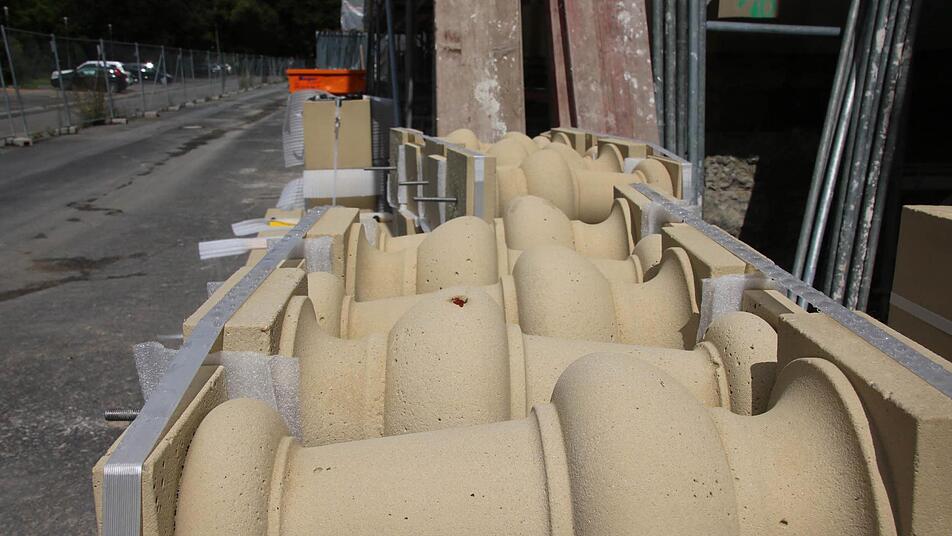 Mehr als tausend Baluster wurden nach historischem Vorbild gegossen und zieren bald die Dächer des Behördenzentrums. Die Bauarbeiten sind genau im Plan.