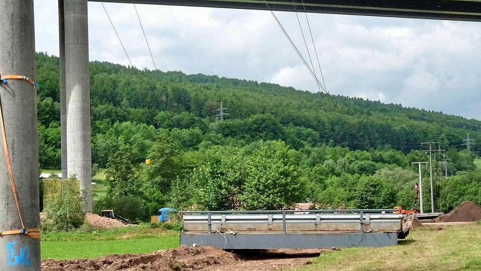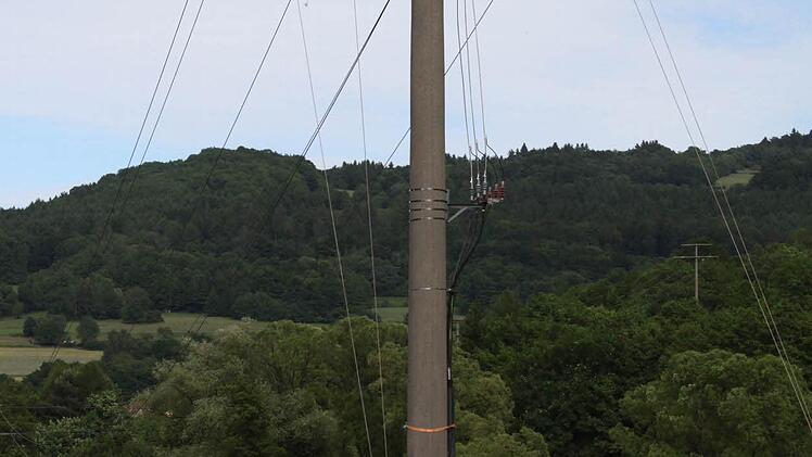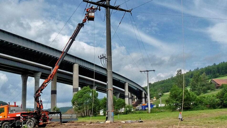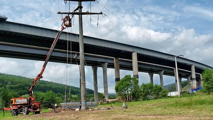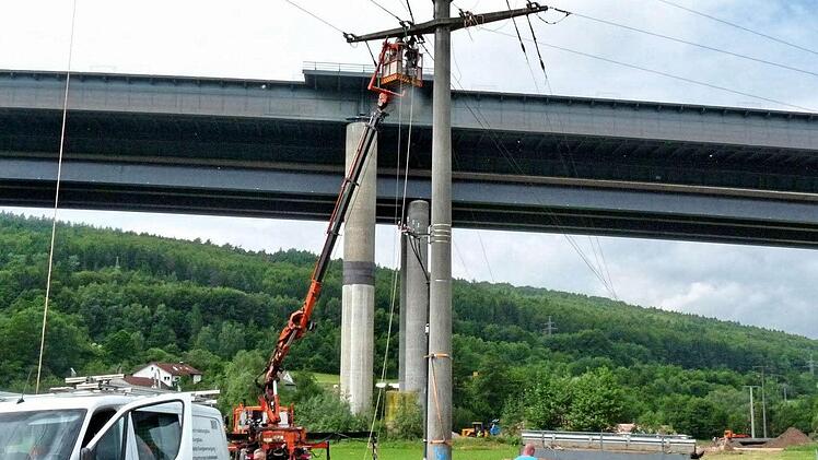 Der Countdown läuft: In vier Tagen ist Sprengtermin an der Sinntalbrücke. Ein letztes Hindernis wurde nun aus dem Weg geräumt: Eine Spezialfirma nahm die 20-Kilovolt-Freileitung durch das Sinntal unterhalb der Brücke ab. Damit verlieren die einzelnen Masten eigentlich auch ihre Spannung. Damit der Zug auf die Betonmasten nicht zu groß wird, wurden jeweils hinter den Masten tonnenschwere Teile des abmontierten Kragarms abgelegt und mit den Masten verbunden.
