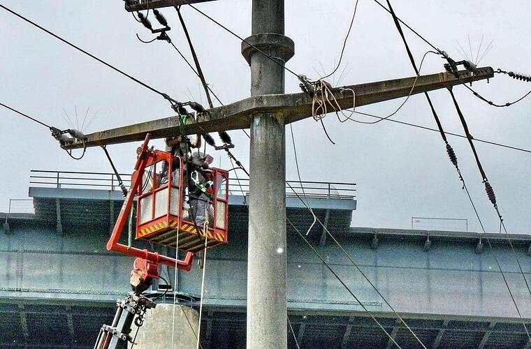 Die 20-Kilovolt-Leitungen unter dem Bauwerk sind abgenommen, der Strom wird durch provisorische Erdkabel geleitet. Teile der Kragarme gleichen den fehlenden Zug durch die Stahlseile aus.