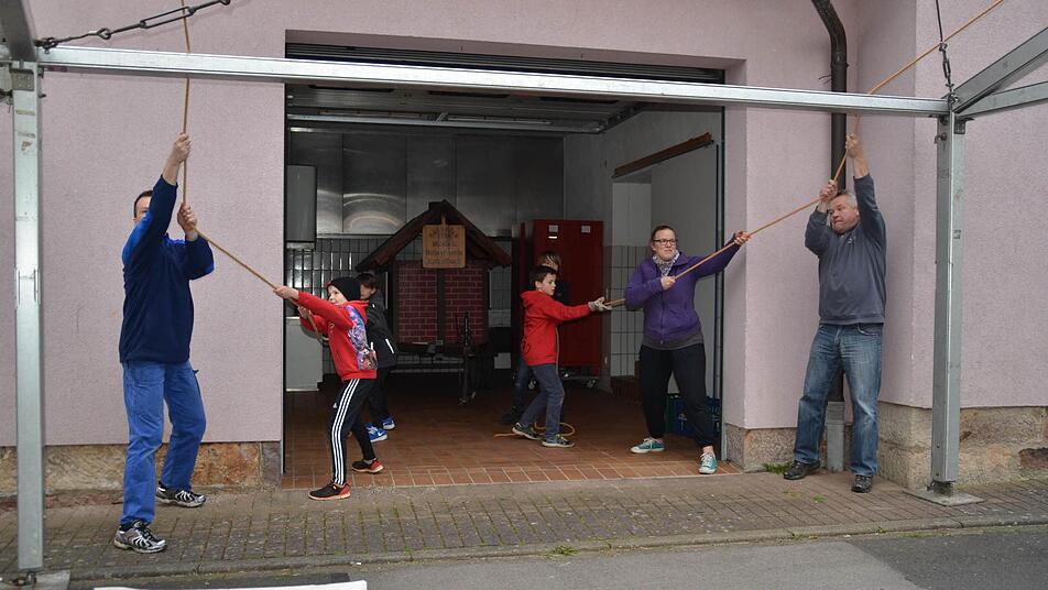 Etwa 20 Männer, Frauen und Jugendliche hatten sich in der Ortsmitte, an der Katzenbacher Kirche eingefunden und innerhalb kürzester Zeit ein Festzelt aufgebaut. "Am Wochenende ist doch wieder Backofenfest", erklärt Friedrich Geis seiner Nachbarin. Er wohnt unmittelbar neben dem Festplatz und stellt den Zeltbauern soeben eine Leiter zur Verfügung.