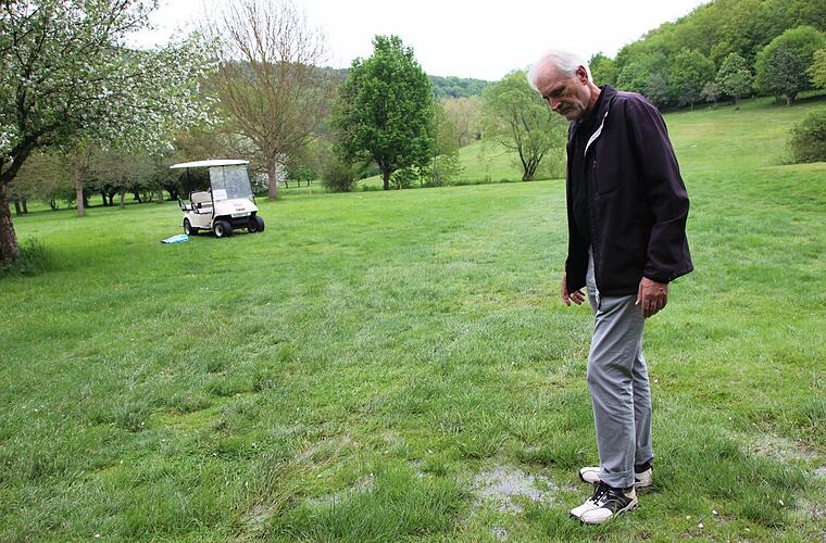 Am Golfplatz in Bad Kissingen ist dieses "Zurück zur Natur" auf jeden Fall nicht gewünscht. Ungefähr so groß wie ein halbes Fußballfeld sei der Morast, der sich auf der Spielbahn 7 gebildet hat, erklärt Golfpräsident Franz-Josef Schäfer. In diesem Bereich holt man sich nicht nur nasse Füße. Eine Golfspielerin versucht an diesem Nachmittag vergeblich ihren Golftrolley über die Fläche zu ziehen. Sie muss einen Umweg nehmen.