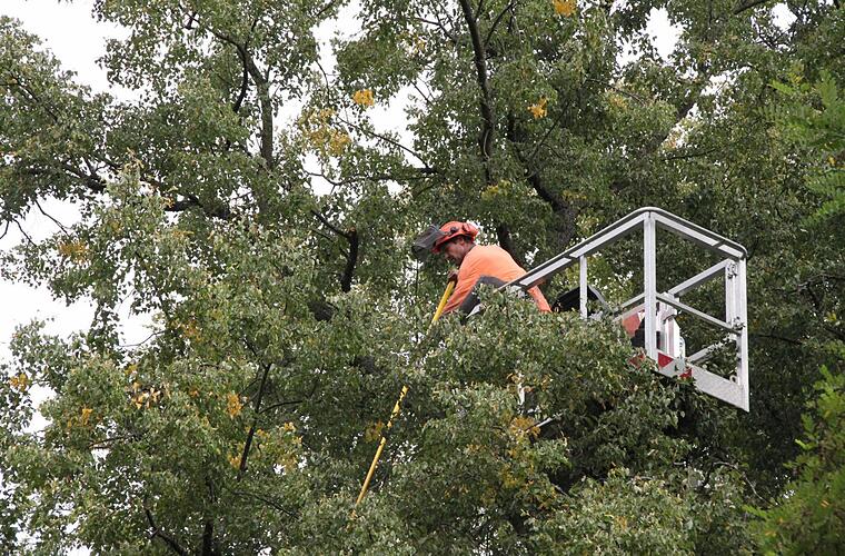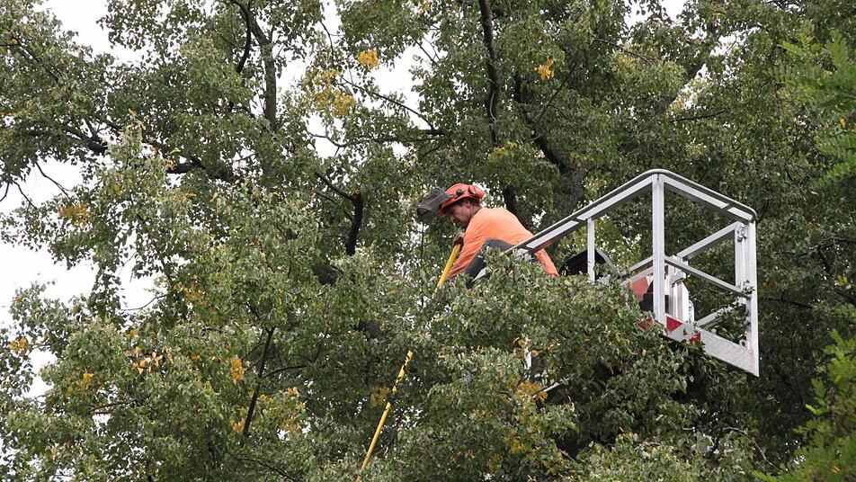 Aktuell lässt die Stadt im Hindenburgpark eine Totholzsicherung durchführen. Eine Nüdlinger Spezialfirma untersucht hoch oben in den Kronen die Bäume nach abgestorbenen Ästen und entfernt sie dann auch gleich.