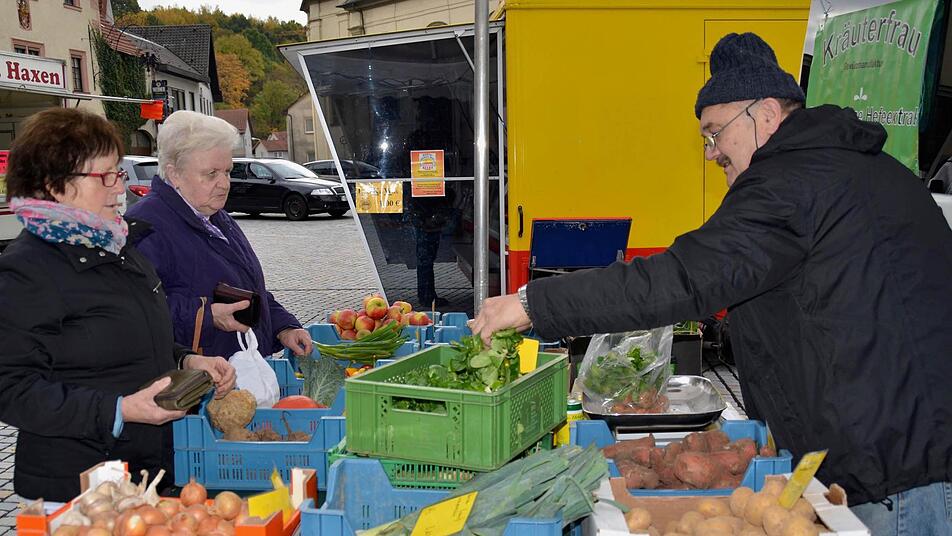 Seit dem Frühjahr steht der Händler aus Völkersleier mittwochs auf dem Burkardrother Marktplatz, wo ein kleiner Wochenmarkt stattfindet. Manchmal ist auch seine Frau vor Ort. Eigentlich betreiben die beiden die Gewürzmanufaktur "Kräuterfrau", sind mit ihren Produkten auf verschiedenen Märkten in Unterfranken unterwegs. Nun kam der Gemüsehandel dazu, in