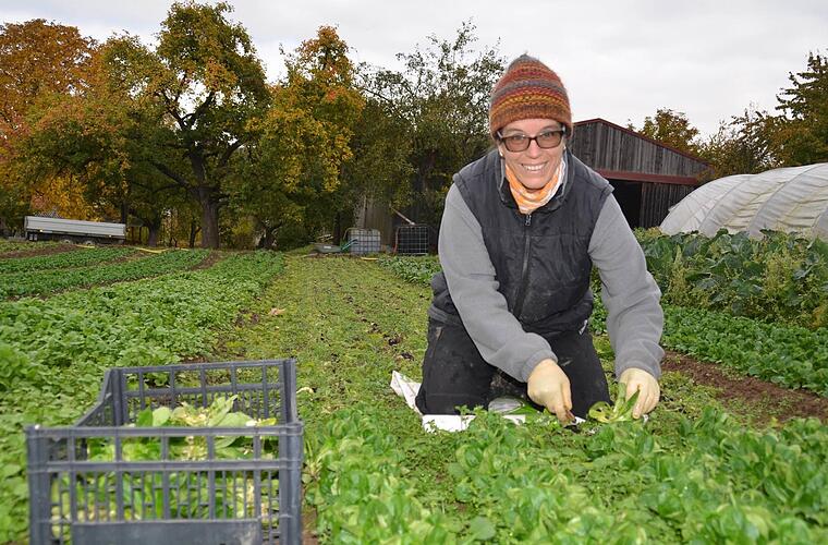Auf dem Hof der Familie Pfülb herrscht momentan Hochbetrieb. Täglich wird hier noch Feldsalat geerntet. Eine mühsame Arbeit, die Eileen Pfülb am Mittwochnachmittag kniend und per Hand verrichtet. Sie und ihr Mann Hans betreiben den Ökolandbau im Fränkischen Saaletal seit 25 Jahren. "Damals hat uns der Naturland-Fachberater dazu geraten, neben Getreide auch Gemüse anzupflanzen", erinnert sich der Landwirt. Eine Entscheidung, die die Familie bis heute nicht bereut hat. Trotz der vielen Arbeit.