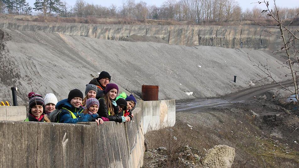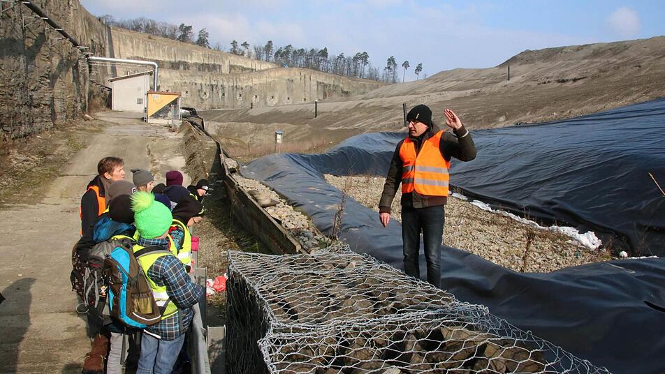 Darauf zeigt Sandwall den Kindern die alte Deponie Arnshausen, in der von 1977 bis 1991 rund 900 000 Kubikmeter Müll eingelagert wurden. Dass dort bis heute verschmutztes Sickerwasser aufgefangen wird und mit dem Gas aus dem Müll ein Blockheizkraftwerk betrieben wird, sorgt für die ersten Aha-Erlebnisse. Mit vielen Zahlen geht es weiter: 300 Meter breit, 600 Meter lang und ursprünglich 70 Meter tief sei der ehemalige Steinbruch gewesen, berichtet Sandwall.