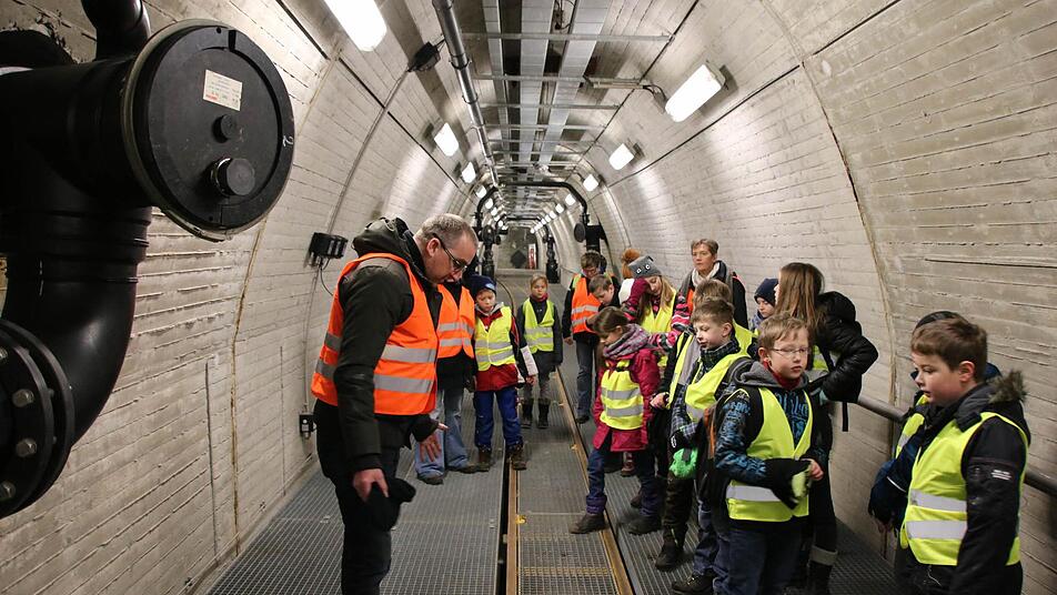 Angehoben werden muss schrittweise auch der Zugang zum "Abflussrohr" der Deponie: Ein Schacht mit sechs Metern Durchmesser führt in den Kontrollgang. 156 Stufen zählen die Schüler aus Oberleichtersbach und sind fasziniert von dem Tunnel, der wie die Kulisse eines Abenteuerfilms wirkt.