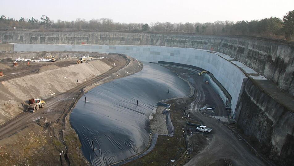 Wie eine Badewanne werde das Loch nach und nach abgedichtet. Tief unten ist der Aufbau gut zu erkennen: Erst wird der Fels in Beton gepackt, dann folgt die eigentliche Abdichtung mit einer Mischung aus Bentonit, Kalkschotter und Gesteinsmehl, davor stehen mit Basalt gefüllte Drahtkörbe, die das Wasser ableiten. Zwei neue Abschnitte im Süden der Deponie (siehe Grafik) werden aktuell ausgebaut.