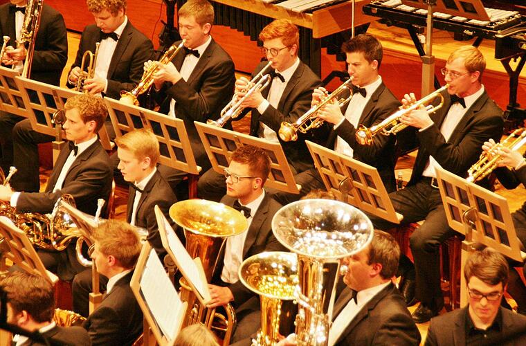für das NBJBO und die NBBB komponiert hat. Der anwesende Komponist und sein Stück wurden von Dirigent, Musikern und Publikum begeistert gefeiert. Als Solist am Schlagwerk brillierte Wolfgang Schniske. Auch die Zugaben überzeugten. Die umfassenden Klänge des Chorals "Deep Harmony" des NBBB ebenso wie der irre Sound von "Arsenal", mit dem beide Orchester ein verblüfftes Publikum entließen.