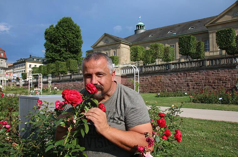 Wenn Holger Paff, stellvertretender Leiter der Kurgärtnerei, in den Rosengarten geht, sieht er natürlich viele Blüten, vor allem aber achtet er auf gelbes Laub. "Da hinten rollen sich die Blätter, die müssen raus, bevor die Pilz-Infektion explodiert", sagt er und deutet auf eine der 128 Sorten. Deshalb kommt täglich mindestens ein Mitarbeiter der Kurgärtnerei vorbei, schneidet verblühte Knospen ab, saugt krankes Laub auf, düngt und gießt. "Zwei Drittel der Mannschaft sind derzeit mit Gießen beschäftigt", sagt Pfaff, dem im Sommer bis zu 30 Mitarbeiter in der Kurgärtnerei zur Verfügung stehen.