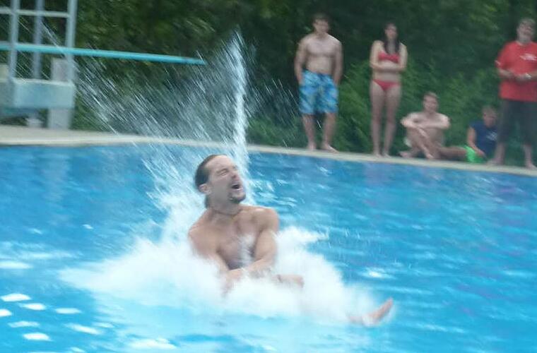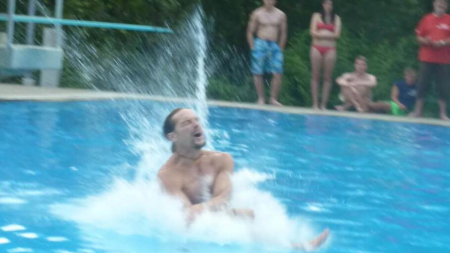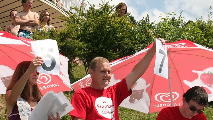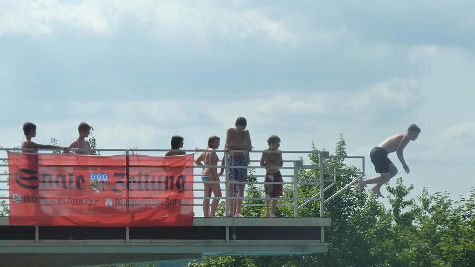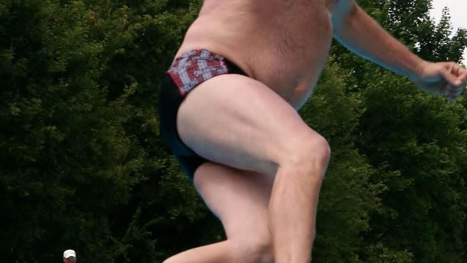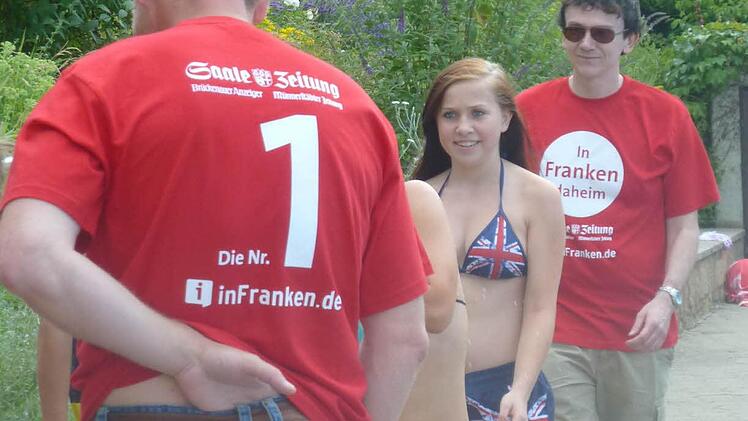 Dejan Graf "bombt" am besten Der Medienpartner Saale-Zeitung sorgte für einen speziellen Wettbewerb am Sprungturm. Schon die Teilnahmebedingungen für den "Arschbombencontest" versprachen lustige Aktivitäten. Dabei zählten Höhe, Volumen und Lautstärke der Wassersäule , aber auch Haltung, Originalität und Show der "Athleten". Keine leichte Aufgabe für die Juroren von inFranken.de, Vertriebsleiter Thomas Neuber und Thomas Reinwand vom Vertriebsmarketing, die den Wettbewerb organisiert hatten. Sie wurden unterstützt von Rosenkönigin Anna-Lena Koch.