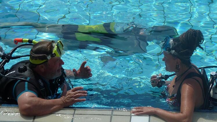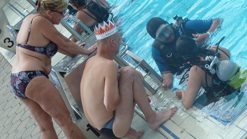 Ein Hauch von Karibik Etwas älter waren die Teilnehmer beim Schnuppertauchen des Tauchclub Nixe. Dort wurden die Teilnehmer unter Wasser fotografiert. Die Schwimmbadkacheln wurden mit einer Fotofolie verdeckt, sodass die Bilder aussehen, als tauche man im Korallenriff. Aquilin Stärker, Vizepräsident des Clubs meinte: " Wir trainieren hier im Sommer jede Woche, aber man muss sich auch in der Öffentlichkeit zeigen, wenn man als Verein attraktiv sein will". Auch die Wasserwacht sieht das so und war mit einem großen Aufgebot vertreten, betreute das Wettrutschen, brachte sich in die Organisation ein und sorgte für die Sicherheit im Wasser.