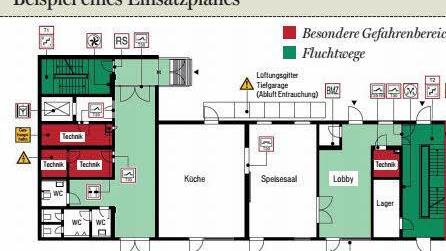 Die Einsatzpläne geben einen schnellen und gleichzeitig detaillierten Überblick, wo sich Gefahrenbereiche befinden (etwa die Hauptleitungen für Gas und Strom, technische Geräte oder gelagerte Chemikalien), wo die Notausgänge sind, wie das Gebäude aufgebaut ist und welche Anfahrtswege es gibt. So weiß die Feuerwehr zum Beispiel, welche Fahrzeuge eingesetzt werden können.