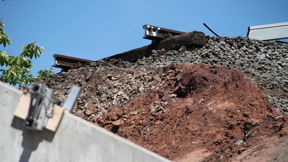 Seit Mittwochabend ist die Bahnstrecke zwischen Ebenhausen und Bad Kissingen gesperrt. Zuerst musste der gesamte Bahndamm abgetragen werden, um die Lücke für die neue Brücke zu schaffen. Danach erfolgte am Freitag der Brückeneinschub. Jetzt wird das Geländemit einem speziellen Verfüllmaterial wieder aufgschüttet. Bis zum Montagfrüh müssen Bahndamm und Schienenverbindung hergestellt sein. Denn dann sollen wieder Züge fahren.