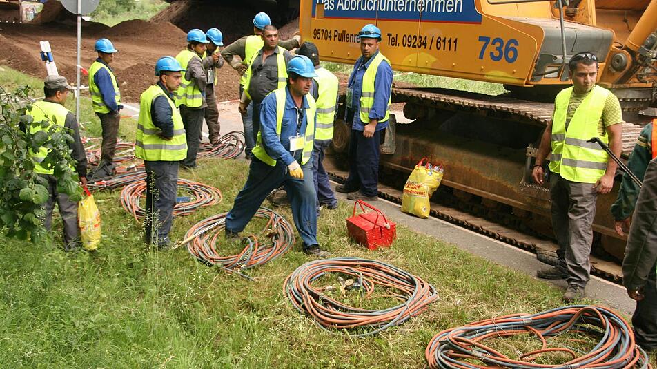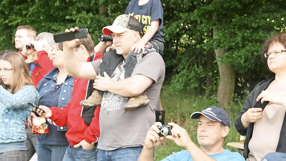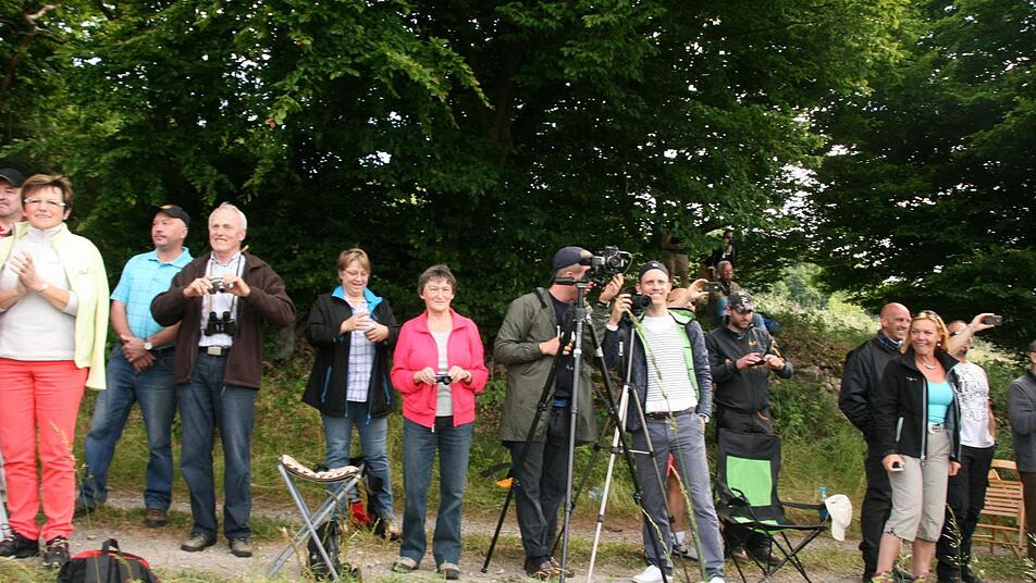 Gegen 8.30 Uhr sind Wallburga und Alfred Fröhlich mit ihren Freunden und mit einem guten Hundert weiterer Zuschauer durch den Wald oberhalb der Straße "Am "Küppel" auf den Gerstenberg gelaufen. Oben hat man einen herrlichen Ausblick auf das Dorf, den Sportplatz, hinüber Richtung Berghaus Rhön und natürlich auch die Sinntalbrücke. Mancher packte ein zweites Frühstück aus, viele hatten Stühle mitgebracht und machten es sich am Rande einer Wiese bequem. Jeder nestelte schon bald an einer Kamera und einem Foto-Handy: Bilder machen wollte jeder.