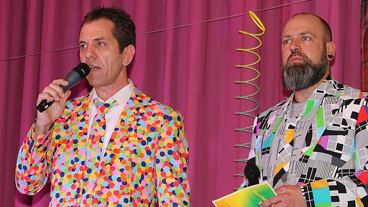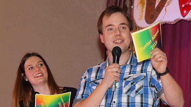 Die 16 jungen Roboter-Teens führten mit Akrobatik und futuristischer Musik die Zuschauer ins Jahr 2095. Einstudiert haben diese Nummer Sonja Wetterich, Anna-Lena Erhard und Florentine Erhard. Bastian Werner erwies sich als wahrer Fußballexperte bei seiner Lesung aus Jogi Löws Buch "Der Ball, das unbekannte Wesen". Er weiß zum Beispiel über den Ball "das Leder außen ist vonnöten, sonst ging die Luft drinnen flöten" oder "wär das Leder außen eckig, dem armen Spieler ging es dreckig". Nach Spanien ging es in der gleichnamigen Show. Diese Gruppe mit 16 jungen Damen und Herren tanzte zu spanischen Rhythmen und wurde vom Publikum mit viel "olé olé " angefeuert. Das "heiße Thema Eheberatung" (so Hergen Vollert) brachten Micha Stahl-Emmer, Volker Stahl und Elisabeth Stahl auf die Bühne. Das Ehepaar Meier kam extra von auswärts, aus Rannungen, zu Doktor Fasel. Der wollte wissen: "Wo liegt das Problem?" Prompt deuteten Herr und Frau Meier jeweils auf den anderen. "Irgendwann, wenn er schläft, dann drück ich ihm das Kissen aufs Gesicht", kündigte sie an und er wusste "ohne sie hätte ich die Probleme gar nicht". Angesichts der Reaktionen im Publikum hatten es die drei auf der Bühne gelegentlich schwer, ernst zu bleiben und lachten selbst mit. Beim Sketch "Klavierspielen" fielen zum großen Vergnügen der Zuschauer die Hosen der elf Mitspieler. Schwungvolle Tänze gab es in der Show "90er" (Trainerin Vanessa Schmitt). Für besondere Effekte sorgten hier die farbigen Leuchtdioden an den Schuhen der jungen Damen. Luca Wilm, Jannik Göller, Moritz Stahl und Elias Stahl boten in ihrer "late night show" einen satirischen Wochenrückblick. Als Überraschungsgast kam Gaby Kanz, ein Urgestein der Bunten Abende, mit Rollator auf die Bühne und erzählte von einer Polizeikontrolle. Den abschließenden "Eklat in der Bar" gab es nur auf der Bühne beim Auftritt des Männerballetts. Diese Nummer wurde von Lena Schmück, Alexander Hofmann und Martin Herbst einstudiert.