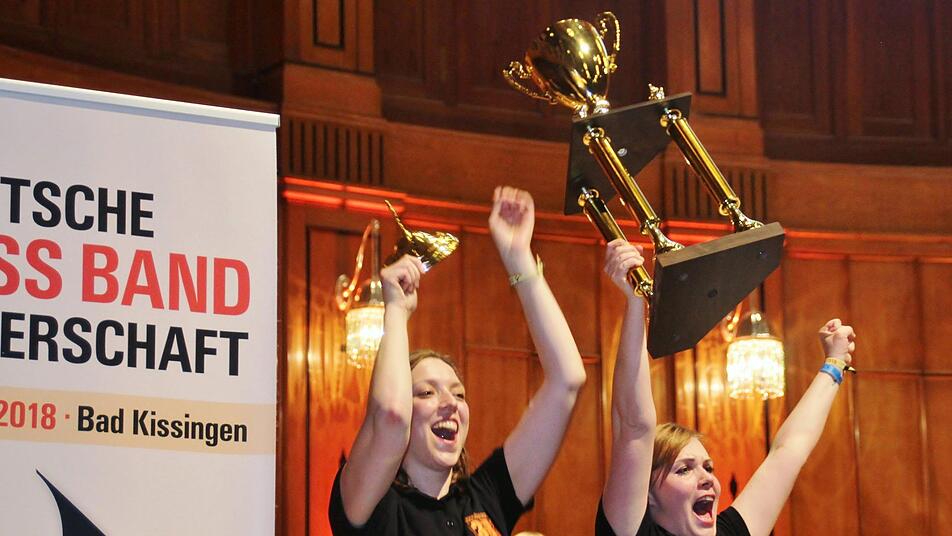 Lucy Kraszlan und Marie Schwarz stemmen gemeinsam den Riesenpott als Sieger der Championship Division in die Höhe. Die 3BA Concert Band der Bayerischen Brass Akademie ist in der höchsten Kategorie einfach nicht zu schlagen. Die Brass Band Sachsen wird ehrenvoller 2. Sieger.