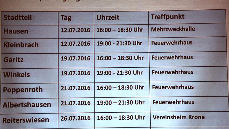 Reichen die die Versorgungseinrichtung in kleineren Stadtteilen? Wie können Leerstände in Ortskernen vermieden werden? Was kann das Ehrenamt leisten? Konsequenzen aus der demographischen Entwicklung? Wie sehen die Bürger das Image ihres Stadtteils? Um diese Fragen zufriedenstellend und zielführend beantworten zu können, wollen die Planer intensiv mit den örtlichen Akteuren zusammenarbeiten. In den nächsten Monaten werden Ortsspaziergänge, Planungsrunden und verschiedene Themenworkshops stattfinden, um die Stärken und Schwächen der einzelnen Stadtteile herauszufinden und wie man damit umgehen soll. Als Grundlage für die Entwicklung von Projekten und Projektideen werden gemeinsam Ziele und Leitsätze formuliert.