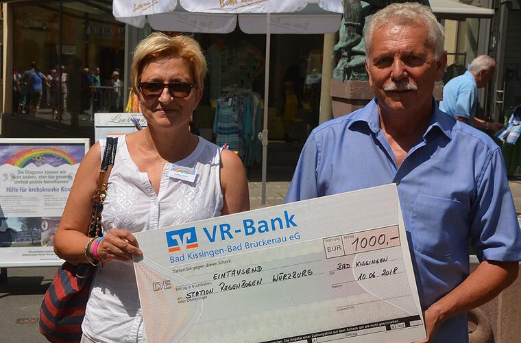 Die Familie Bögner hat zwar keine Kinder auf der Onkologiestation, "aber vor 33 Jahren, als damals unser Zwillingspärchen geboren wurde, waren die beiden zehn Wochen zu früh dran und kamen auf die Frühchenstation, und wir sind fast jeden Tag von Bad Kissingen nach Würzburg gefahren". So entstand, als Jahre später die Station Regenbogen gegründet wurde, der erste Kontakt, und nun wurde ein Scheck über 1000 Euro an Andrea Green übergeben, damit der Verein weiter das Los der kleinen Patienten und auch ihrer Eltern ein bisschen zum Besseren verändern kann.