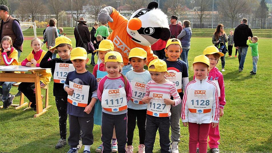 Nach einer lustigen Aufwärmphase mit dem Orthopäden Matthias Haase, der sich selbstironisch auch als Hase verkleidet hatte, und dem DAK-Dachs, herrschte ein wildes Gewusel auf dem Rasen im Aschenbahn-Rund.