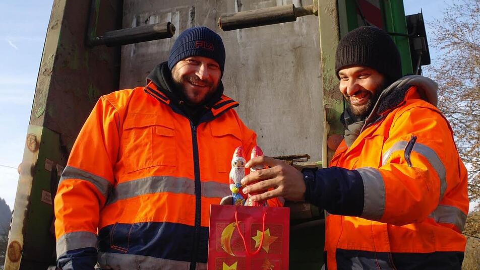 Zu den Festtagen binden die Müllwerker, wie die Müllmänner eigentlich heißen, nun die kleinen Dank-Bekundungen der Leute, die sie nie zu Gesicht bekommen, von den Mülltonnen. "Meistens ist es etwas Süßes. Wir haben aber auch schon mal ein Päckchen Kaffee und Kinderbilder mit Müllautos bekommen", erzählen Klaus Voll und sein Kollege Nabil Atyeh. "Man muss schon manchmal lächeln."
