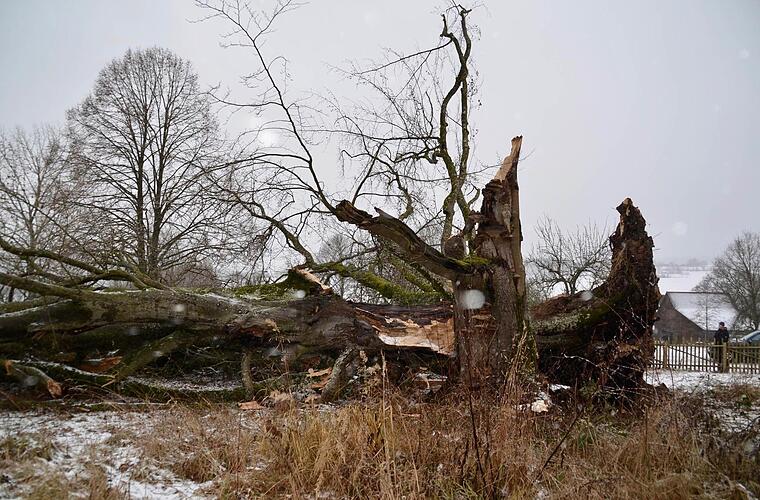 Die geschätzt 350 Jahre alte Rotbuche war schon länger in einem maroden Zustand. Bereits im Sommer zeichnete sich ab, dass ein Teil des Baumes abstirbt. Experten hatten das bestätigt und ihn regelmäßig begutachtet. "Im Übrigen waren erst vergangene Woche Mitarbeiter bei der Hutbuche, haben nach ihr gesehen und besprochen, wie sie weiter gepflegt werden soll. Geplant war beispielsweise, den Baum demnächst zurückzuschneiden", teilt Lena Pfister mit. Doch das hat sich nun erledigt. Ein Teil der Hutbuche ist am Freitagvormittag umgekippt, ein anderer abgebrochen. Vermutlich hat sie den orkanartigen Böen, die durch die Vorrhön zogen, nicht mehr standgehalten. Nun ragt nur noch ein Stumpf aus dem Boden. Das könnte sich jedoch schon bald ändern.