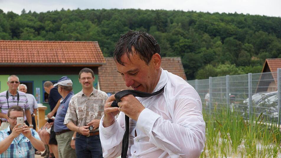 Thomas Hack macht es seinem Vater gleich: Unter Bürgermeister Adolf Hack ging 1973 das Schwimmbad in Betreib. 40 Jahre später eröffnet Bürgermeister Thomas Hack an selber Stelle das Naturbad Aura. Nach den offiziellen Reden springt er in Hemd und Hose in das Becken.