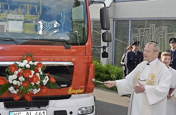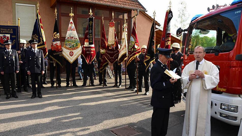Pfarrer Benno Tietz erbat Gottes Segen für das neue Einsatzfahrzeug der Feuerwehr Albertshausen. Die Bad Kissinger Wehren feierten gleichzeitig Florianstag.