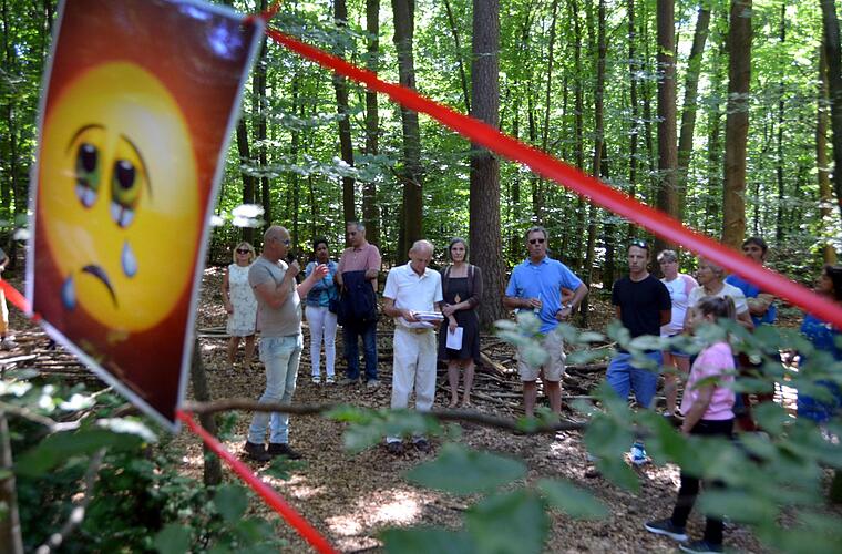 So waren bei einem Rundgang alle Teilnehmer total erschüttert, dass es sowohl an den Gesprächen, sprich Informationen seitens der Stadt gemangelt habe und dass trotz Protesten mit großem Maschineneinsatz im Wald zu Fällaktionen gekommen sein. Als Alternative für die geschätzten rund 100 Bäume "die ihr Leben lassen mussten" pflanzten die Verantwortlichen ein gutes Dutzend heimische Laubbäume und als Überraschung ließ Dr. Galuska wissen: "Ich bin bereit, der Stadt dieses 14,5 Hektar große Waldgrundstück abzukaufen, damit so etwas nicht noch einmal passiert, damit nicht noch einmal 4000 Jahre Baumleben innerhalb weniger Tage zerstört werden". Die Stadt allerdings ließ schon vorweg durch ihren Sprecher Thomas Hack erklären, dass eine routinemäßige Verkehrssicherung zweimal im Jahr anstünde, denn "je mehr Menschen dort unterwegs sind, desto größer sei auch das Gefahrenpotenzial".
