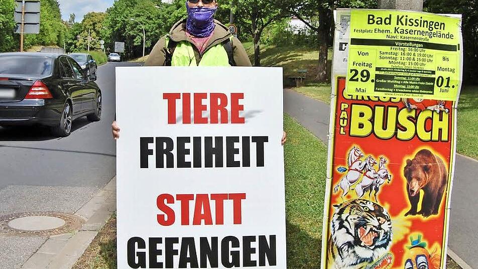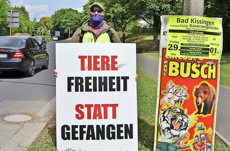 Seit der Schweinegrippe vor sechs Jahren wird Klaus Henke (53) immer wieder mal aktiv und demonstriert für die Freiheit und das Lebensrecht der Tiere. So stellte er sich auch am Samstag mit seinem großen Protestschild ein paar Stunden lang an den Nordring direkt neben das Werbeschild eines Zirkus. "Ich kämpfe nicht gegen diesen Zirkus, aber der Anlass bot sich an", meinte der in einer Kissinger Klinik arbeitende Physiotherapeut.