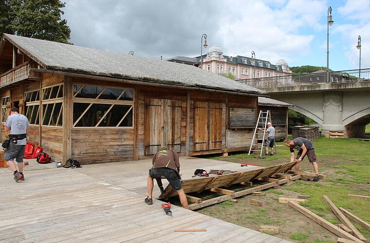 Aktuell werden die Terrasse und die Almhütte auf dem Gelände aufgestellt. Dafür hat sich die Firma KissEvents als Veranstalter Hilfe geholt: Die Firma Schmid Kunstholzbau aus Pleiskirchen, bei Altötting, ist für den fachgerechten Aufbau über 350 Kilometer nach