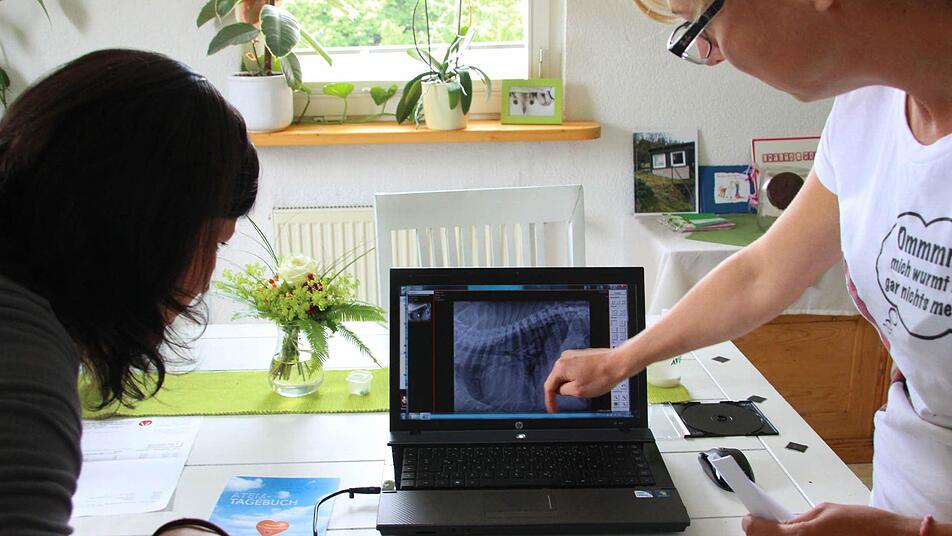 Tierärztin Sabine Sell bespricht am Esszimmertisch mit Katja Hose das Röntgenbild von Buddy. Buddy ist ein stattlicher, acht Jahre alter Bullmastiff und hat Atemprobleme. Sabine Sell ist bei Katja Hose daheim, Buddy begrüßt Sabine Sell stürmisch. Er kennt sie mittlerweile schon gut. Sabine Sell kommt zur Visite immer ins Haus ihrer Patienten. Sie betreibt eine mobile Tierarztpraxis und ist eine von zwei Tiermedizinerinnen in der Region, die auf diese Weise praktiziert.