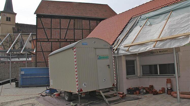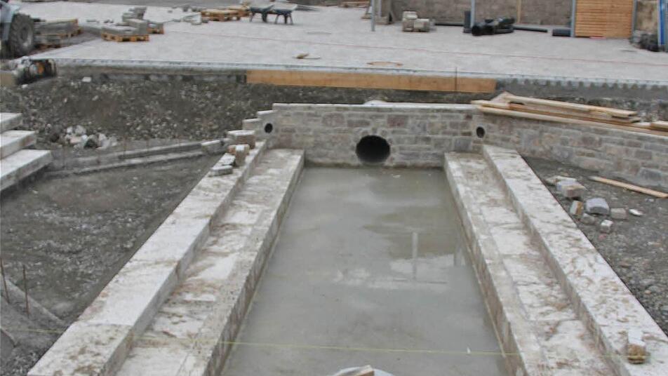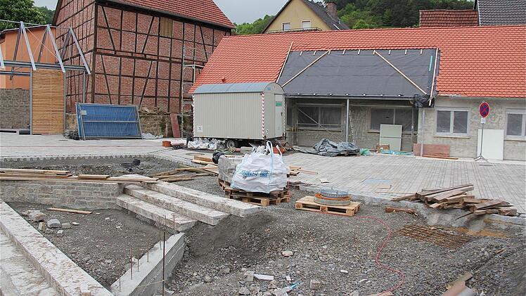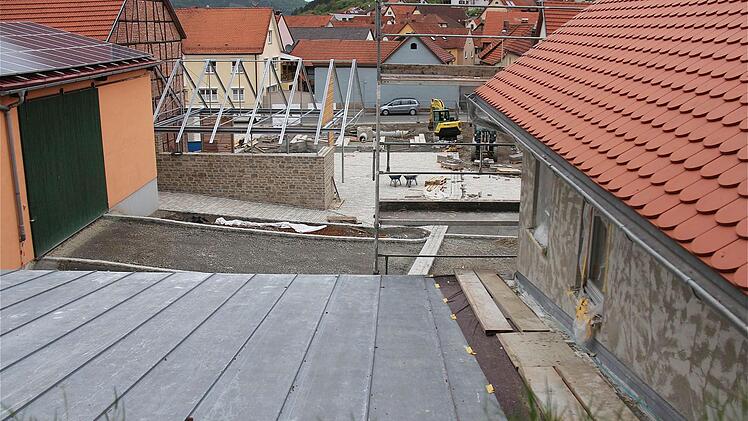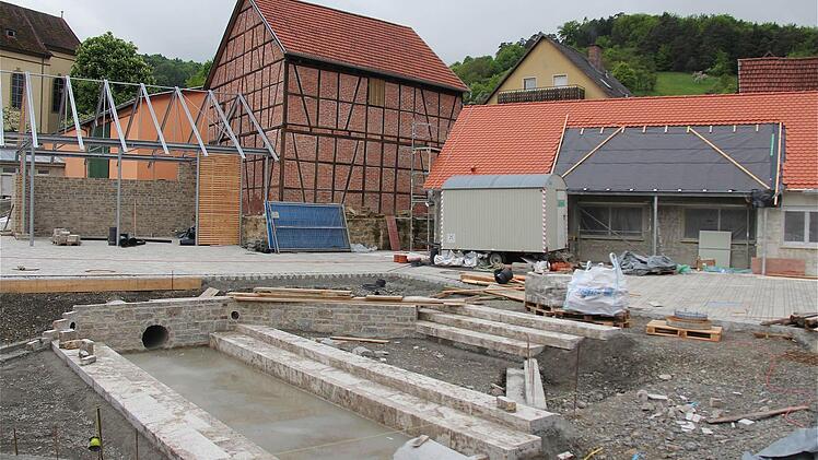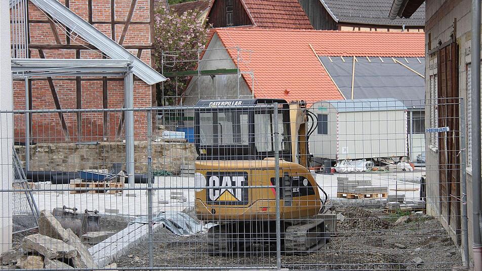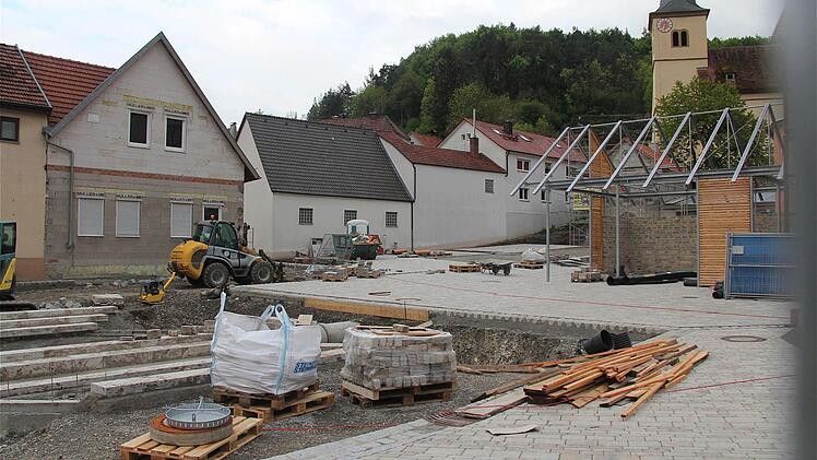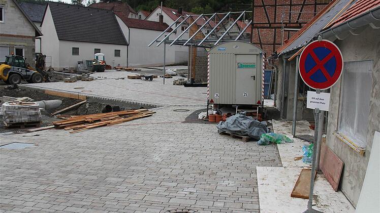 Mächtig voran geht es auf der Baustelle Sulzthaler Dorfplatz. Zurzeit wird der Platz gepflastert und die Gebäude streben ihrer Vollendung entgegen, wie sich die Mitglieder des Gemeinderats vor ihrer Sitzung am Montag überzeugen konnten. Bei der farblichen Ausgestaltung entschieden sie sich für ein helles Grün. Erfreut zur Kenntnis nahmen die Räte, dass das zuständige Amt für Ländliche Entwicklung (ALE) Würzburg neun Dorfplatz-Bäumchen mit