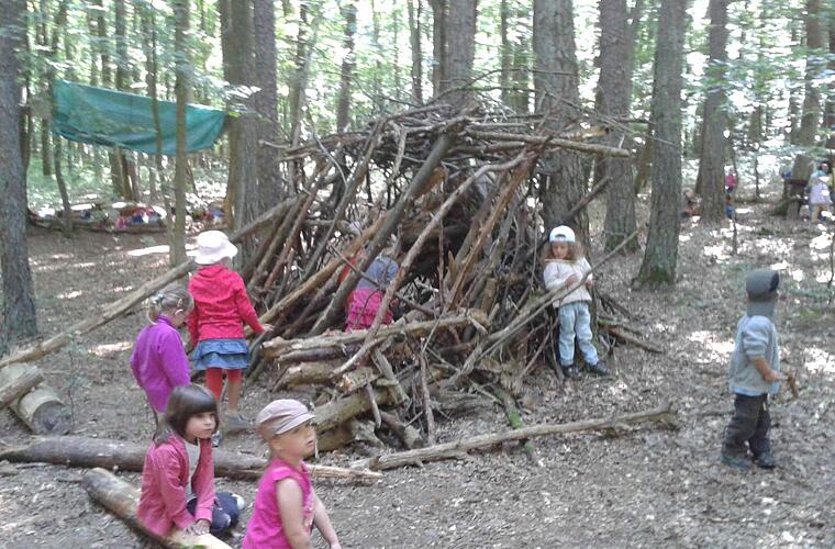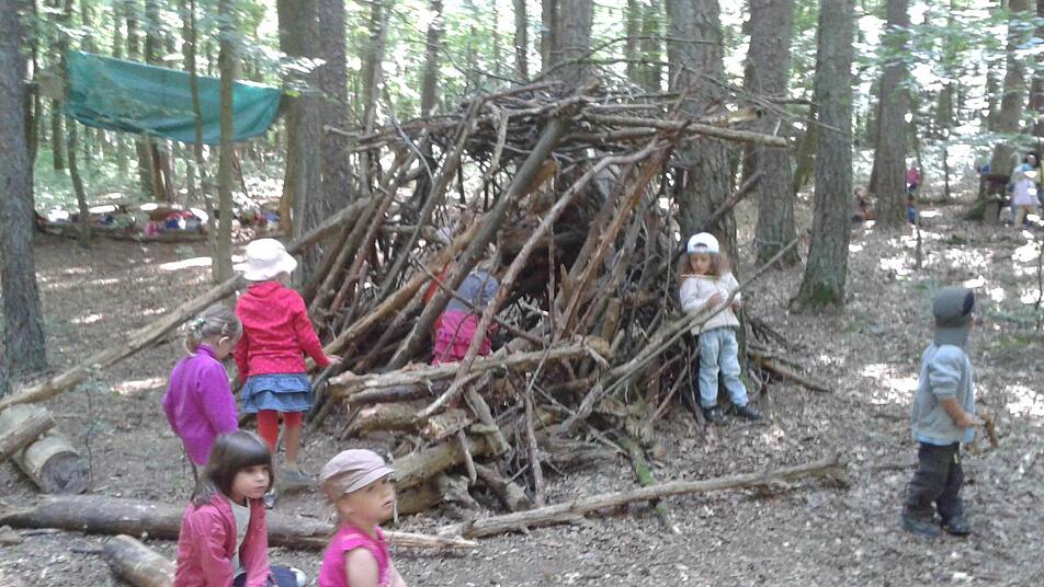 Der Kindergarten St. Martin in Eltingshausen hat sich drei Wochen lang dem Schwerpunktthema Wald gewidmet. Die Kinder trafen sich früh am Sportplatz. Nach der Besprechung der Vorhaben einschließlich der "Waldregeln" machten sie sich auf den Weg in den Wald. Sie bauten Holzunterstände und legten mit Naturmaterialien Bilder auf den Waldboden. Selbst die Zweijährigen machten begeistert mit.