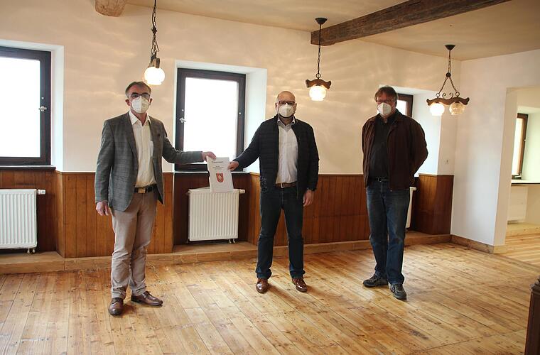 Auffallend ist der neue, beziehungsweise alte Holzboden, der sich unter dem PVC-Boden verbarg und jetzt freiliegt. Der Bürgermeister ist offensichtlich angetan von dem historischen Wirtshausboden: "Was der Boden wohl für Geschichten erzählen würde, könnte er sprechen." Die Firma Parkett Hofmann hatte ihn erneuert. Den Boden im kleinen Nebenraum nahm sie komplett heraus und ersetze ihn mit einem Lärche- Douglasie-Belag aus dem Gemeindewald Nüdlingens. Diese Arbeiten machten etwa 10 000 Euro aus.