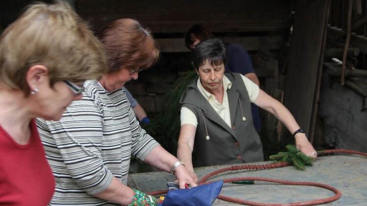 Die Arbeit im Hof von Michael Bötsch gleicht dem Adventskranzbinden - nur dass alles viel größer ist. Mehrere Meter lang ist die Girlande. Der Eisenkranz hat einen Durchmesser von mindestens drei Metern. Die Arbeit ist typische Frauensache. Nur Michael Bötsch kommt vorbei und packt schnell mit an, wenn der schwere Kranz verrückt werden muss. Er kennt jeden Handgriff vom Baumholen bis zum Aufstellen. Er hat auch viele der Werkzeuge und Utensilien selbst gebaut, die es rund um den Maibaum braucht.