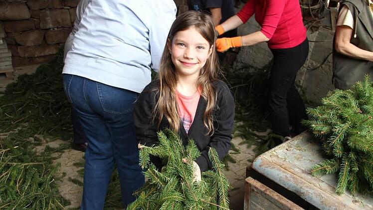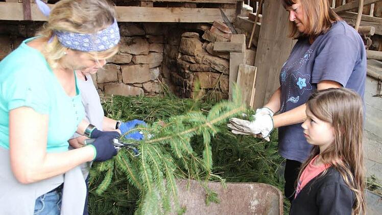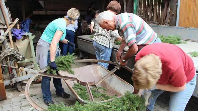 "Die Männer holen immer die Baumspitze und die Wedel", erklärt Anneliese Seith. Das ist deren Aufgaben. Beim Binden bleiben die Frauen weitgehend unter sich. "Männer waren da noch nie dabei", sagt Andrea Hammer - "beim Zwiebelschneiden übrigens auch nicht", ergänzt Gunda Tüchert. Vorsitzender Arnold Nöth guckt vorbei. Er sorgt immer für die Belohnung - nach getaner Arbeit gibt es Kaffee und süße Stückchen.