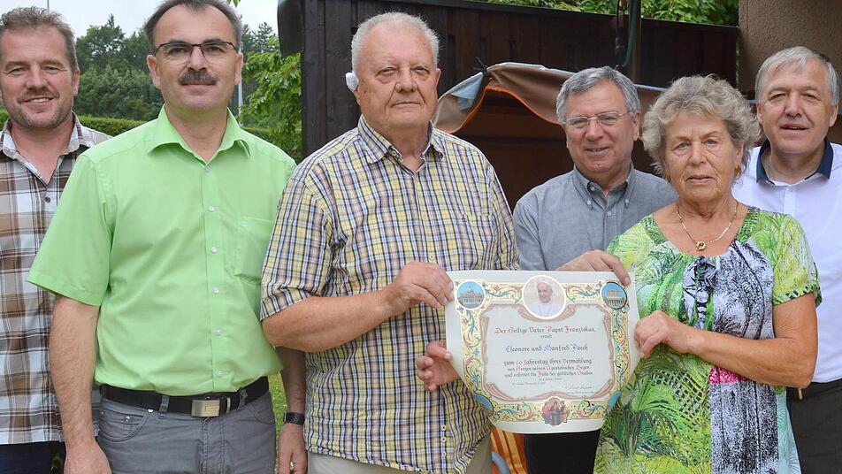 Daran haben die höchsten Repräsentanten der Gemeinde, Bürgermeister Harald Hofmann und zweiter Bürgermeister Edgar Thomas, keinen Zweifel. Sie gehörten zu den Gratulanten ebenso wie Altbürgermeister Adalbert Kiesel, Philipp Klein von der evangelischen Kirchengemeinde und Pfarrer Dominik Kesina, der sogar eine Glückwunschurkunde, unterschrieben von Papst Franziskus, mitgebracht hatte.