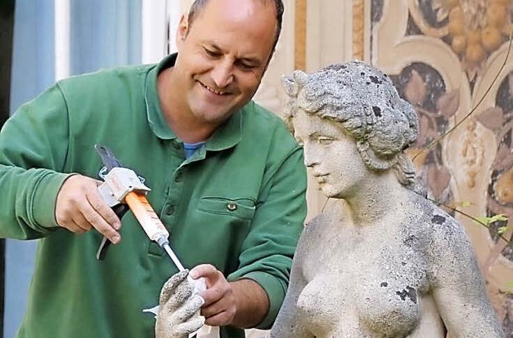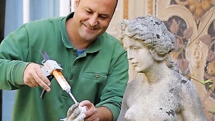 "Die Hand ist so filigran, ein bisschen Druck und der Stein bricht sofort." Langsam und mit einem kleinen Akku-Bohrer arbeitete sich Kessler durch die Hand der Jagd-Göttin. In das Loch wurde ein Gewindestab geklebt, damit beide Teile des Pfeils in einer Linie zueinander stehen.