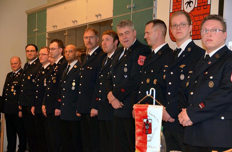 Bevor es jedoch zu den Ehrungen kam, überreichte das Kommando wie in den vergangen Jahren noch Gutscheine an die häufigsten Teilnehmer am Übungsdienst und, das ist neu, an all jene Kameraden, die im Jahr 2018 bei über 100 Ernstfalleinsätzen beteiligt waren. Kommandant Harald Albert stand hier mit 198 gefahrenen Einsätzen ganz oben auf der Liste, danach kommen Alexander Beck 163, Timo Dösch 162, Denny Heinsmann 155, Christian Harnus 140, Jürgen Loose 129, Peter Krammer 123, Benjamin Heuring 120, Marco Albert 119, Dieter Bender 119, Dominik Zehe 108, Timo Jan Deen 107 und Rainer Schmitt 102.