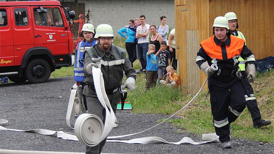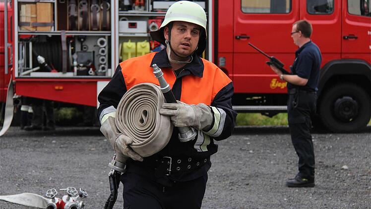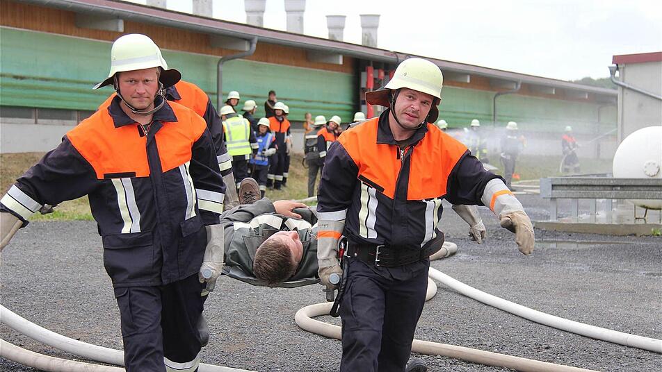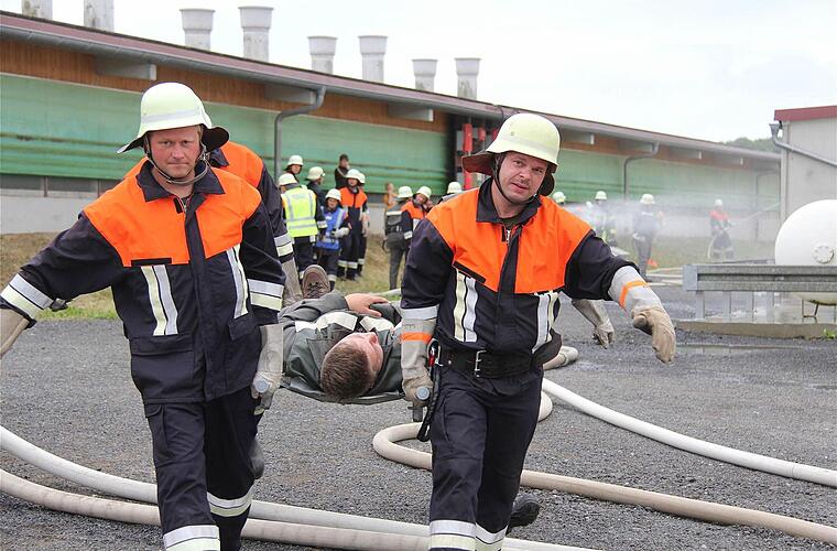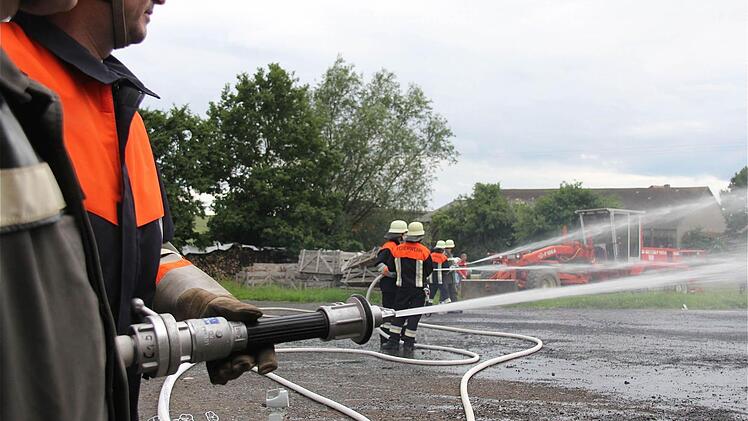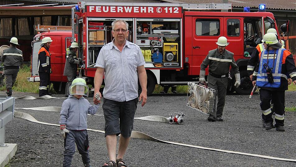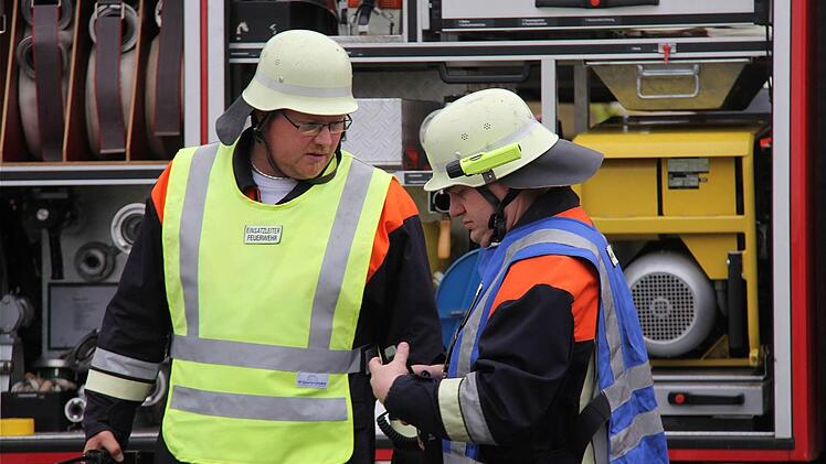 Ein virtueller Brand in den Betriebsräumen von Voglers Hofprodukten war das Szenario für die Übung der Floriansjünger. Zur Unterstützung waren außer Heiligkreuz sämtliche Wehren aus der Gemeinde Wartmannsroth und die Nachbarfeuerwehr Hetzlos ausgerückt. Der stellvertretende Kommandant Christian Kohlhepp führte das Kommando. Kreisbrandinspektor Peter Sell war zufrieden mit dem Übungsergebnis. Er schätzte die Beteiligung der Einsatzkräfte auf insgesamt 70 Feuerwehrleute.