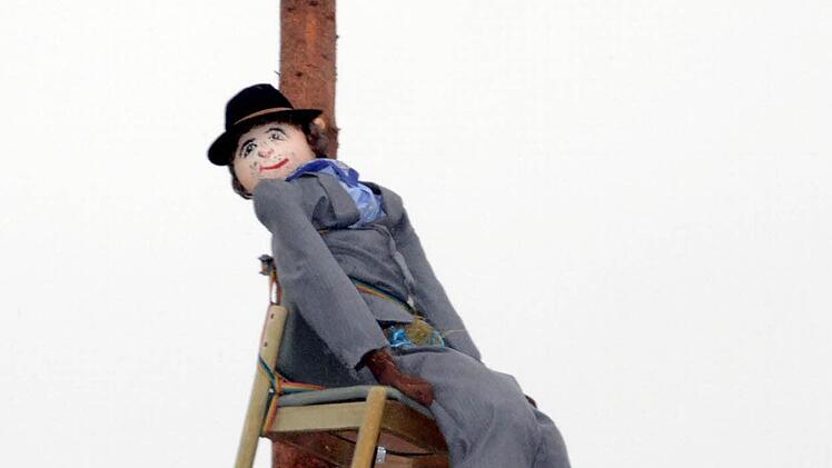 Nur einer muss draußen bleiben: Der Kirmesjokel. Festgezurrt sitzt die Strohpuppe in luftiger Höhe als wolle sie den Kirmesbaum bewachen.
