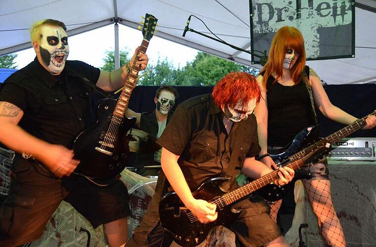 Super, mit dabei zu sein Da waren sich die beiden mit der Band "Dr. Hell" einig. Die "untoten Musiker" DanDan Delirious (Vokals), Ina Insanity (Bass) und Mike Maniac (Drums) ließen durch Guitar-Man Podo Panic ausrichten, dass man sich immer riesig freue, bei diesem tollen Event in Kissingen auftreten zu dürfen. Die Rockgruppe, die nach eigenen Angaben von den "Bloody Islands", einer Ecke in der Nähe von Schweinfurt, stammt, muss es wissen, tritt sie doch bundesweit auf.